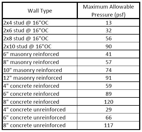 Formulae have been used for over a decade to predict peak pressures and to size PRVs for thousands of enclosures without damaging those enclosures. Since the research project2 showed that the actual peak pressures exceeded those predicted by the previously used formulae by at least 100%, and many of those enclosures were discharge tested with inert agents, it is safe to say that a wide range of enclosures handled 0.07 PSI (500 Pa) of peak pressure. This has also been verified with the use of a high output fan to pressurize enclosures where no effects were observed at 0.07 PSI (500 Pa). One can therefore assume that a double sided wall, securely fastened top and bottom, will handle 0.07 PSI (500 Pa). This can also be tested using a high pressure door fan.
