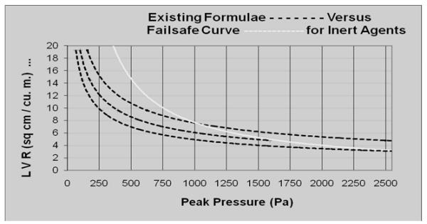 Sufficient data was gathered to more accurately predict the peak pressure for all agents. Figure 3 shows the new curve (in white) developed for inert agent peak pressure versus leak to volume ratio (LVR). Previously-existing formulae (dashed lines) all under-predict the peak pressure expected at a given LVR over the typical peak pressure values from 250 to 500 Pa. Figure 4 shows the results of testing of peak pressures versus LVR for all tested inert agents in the research.