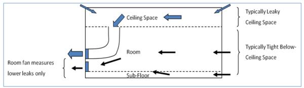 | Figure 5: One door fan depressurizes the room while the second depressurizes above the ceiling so the pressure across the ceiling is zero, which allows determination of the room leaks separate from above-ceiling leaks. |