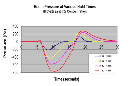Peak pressure varies over time depending on the ratio between the leakage area of the enclosure and the volume of the room (LVR). In a typical halocarbon agent discharge, as shown in Figure 2, the peak pressure increases with enclosure tightness. This determines the hold times as shown in the legend. Although peak pressure is referred to by the NFPA 2001 Standard, the standard does not yet provide guidance on how it is to be calculated.